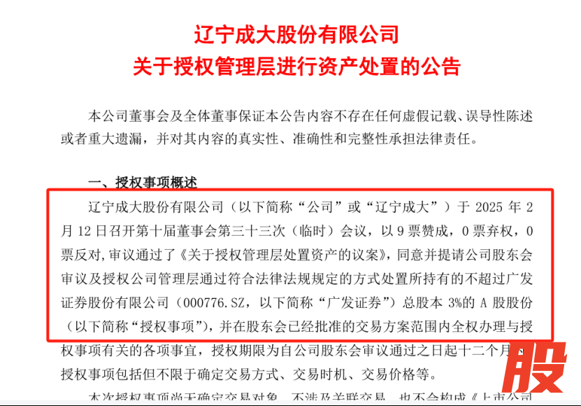2月12日晚间,辽宁成大公告称,该公司于2月12日召开董事会,审议通过授权管理层通过符合法律法规规定的方式处置所持有的不超过广发证券总股本3%的A股股份,授权期限为自股东会审议通过之日起12个月内。