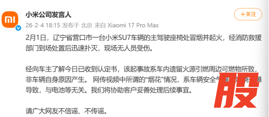 2月4日,小米公司发布声明:经向车主了解今日已收到认定书,该起事故系车内遗留火源引燃周边可燃物所致,非车辆自身原因产生。网传视频中所谓的“烟花”情况,系车辆安全气囊因燃烧引爆导致,与电池等无关。小米方面将协助客户妥善处理后续事宜。