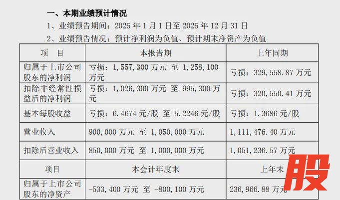 更为严峻的是,期末归母净资产预计为-53.34亿至-80.01亿元,触及退市风险警示规定,年报披露后大概率被冠以“*ST”字样。