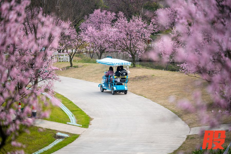 园内地势起伏、水系蜿蜒,沿花径漫步,不时可见“临水照花”之景。新推出的“彩虹游船体验”也成为亲子家庭的热门选择。泛舟花树掩映的河道上,从水上看岸边的烂漫,春意更添几分灵动。